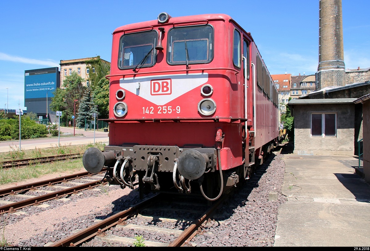 Blick auf 142 255-9 (242 255) der Traditionsgemeinschaft Bw Halle P e.V., die auf dem Museumsgelände ausgestellt ist.