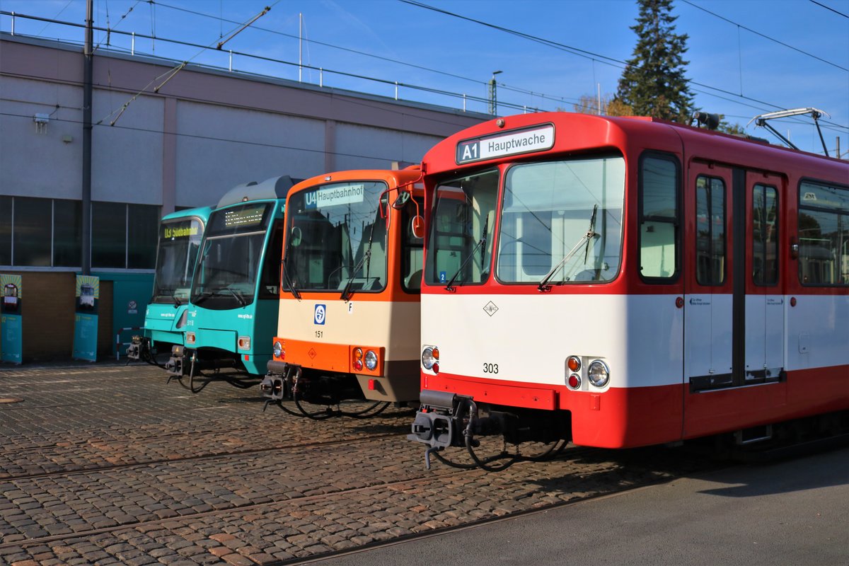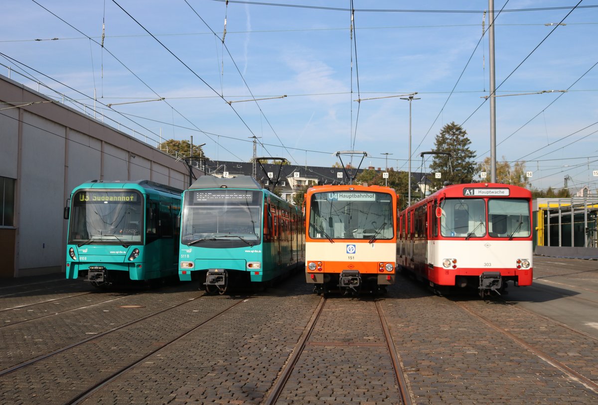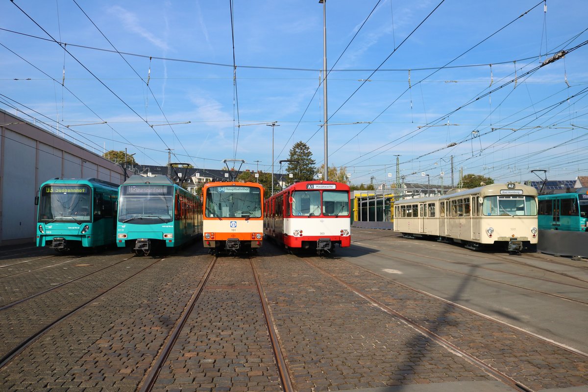 VGF Fahrzeugparade zum Jubiläum 50 Jahre U-Bahn Frankfurt am Main am 06.10.18 in Heddernheim mit Bombardier U5 Wagen 610, Siemens U4 Wagen 511, Düwag U3 Wagen 151 und Düwag U2 Wagen 303