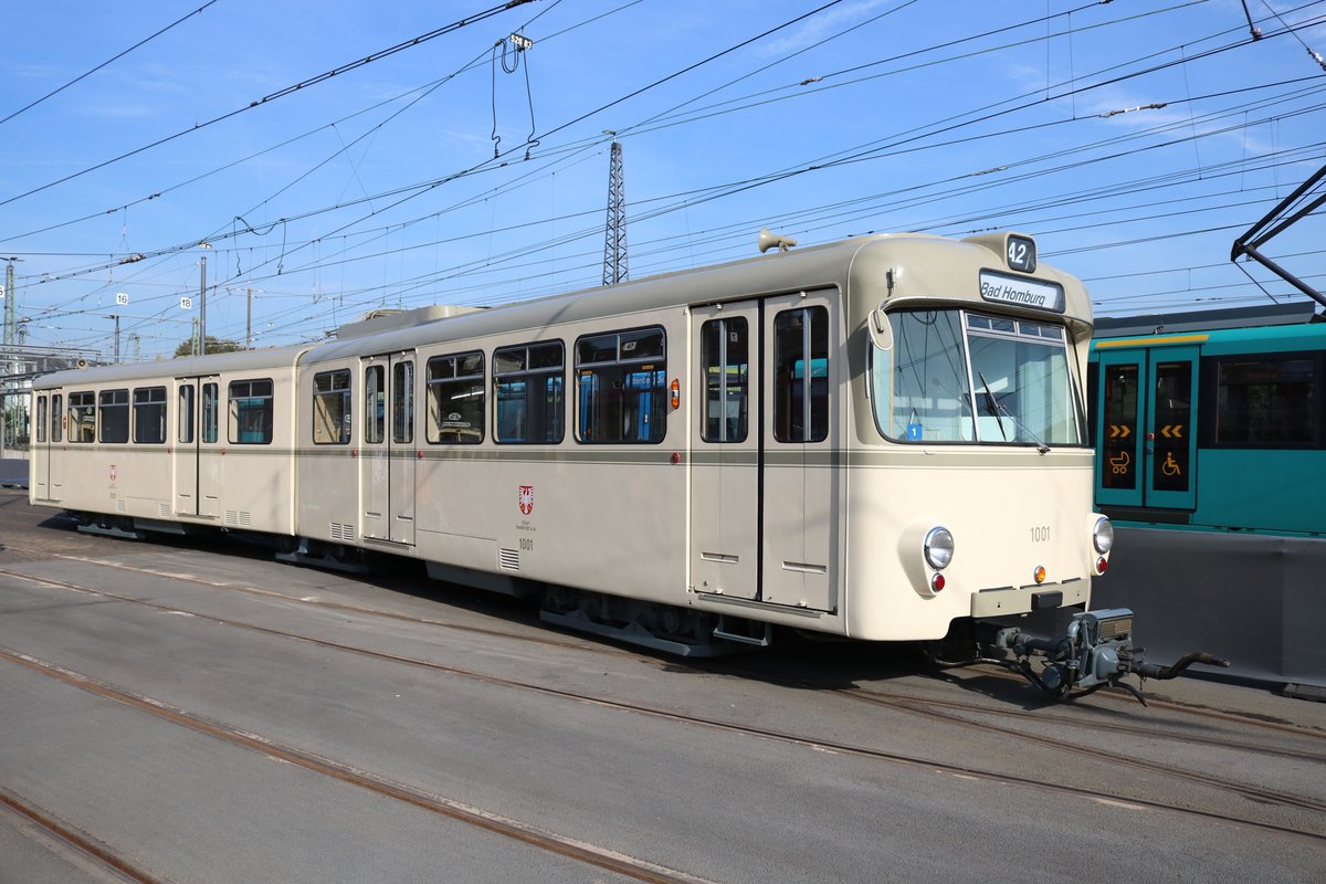 VGF Fahrzeugparade zum Jubiläum 50 Jahre U-Bahn Frankfurt am Main am 06.10.18 in Heddernheim mit Düwag U1 Wagen 1001 (Prototyp)