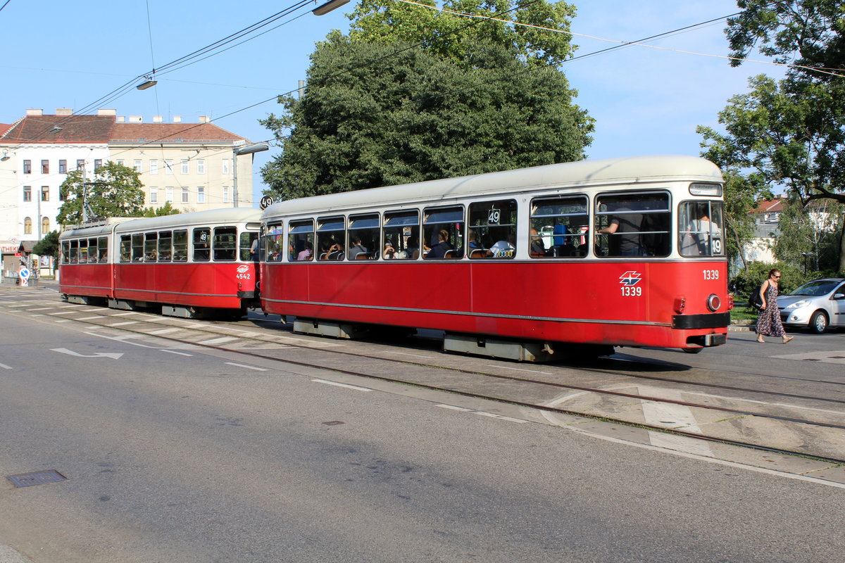 Wien Wiener Linien SL 49 (E1 4542 + c4 1339) XIV, Penzing, Breitensee, Hütteldorfer Straße / Missindorfstraße am 23 Juli 2018. - Bombardier-Rotax, vorm. Lohnerwerke, baute 1975 sowohl den Tw E1 4542 als auch den Bw c4 1339.