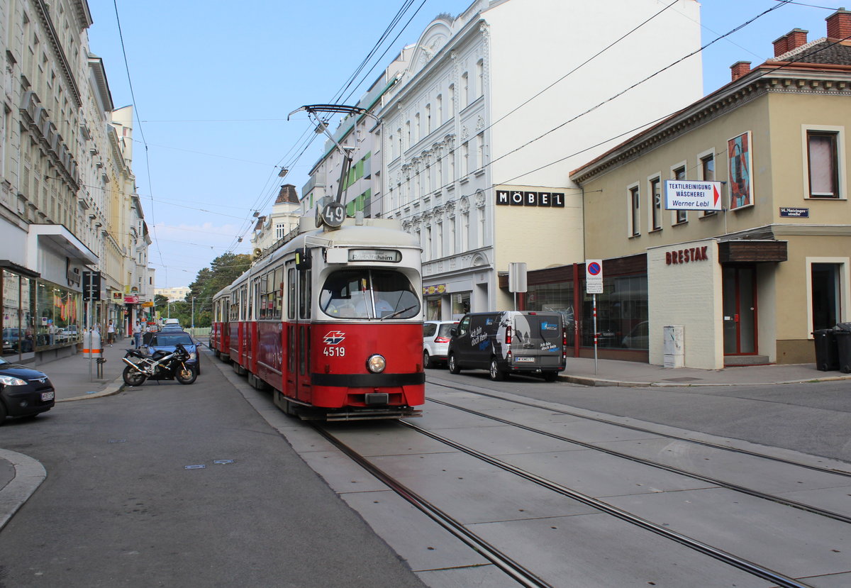 Wien Wiener Linien SL 49 (E1 4519 (Lohnerwerke 1973) + c4 1360 (Bombardier-Rotax, vormals Lohnerwerke, 1976)) XIV, Penzing, Breitensee, Hütteldorfer Straße / Sebastian-Kelch-Gasse / Matzingerstraße am 24. Juli 2018.