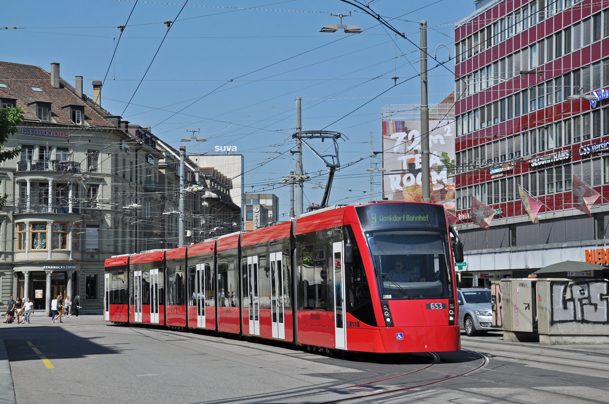 Be 6/8 Combino 65, auf der Linie 9, fährt zur Haltestelle beim Bahnhof Bern. Die Aufnahme stammt vom 09.07.2018.