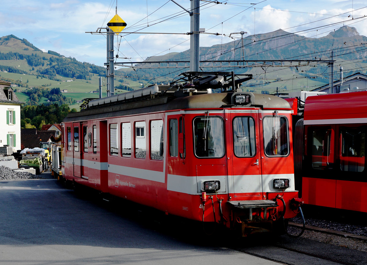 Nicht gestellte Fahrzeugparade mit BDe 4/4 46, ABe 4/6 4006 "TANGO" sowie dem ABe 4/12 1002 "WALZER" in Appenzell vom 6. Oktober 2018. Der BDe 4/4 46 mit Jahrgang 1968 sieht neben den beiden jungen Arbeitskollegen sehr alt aus.