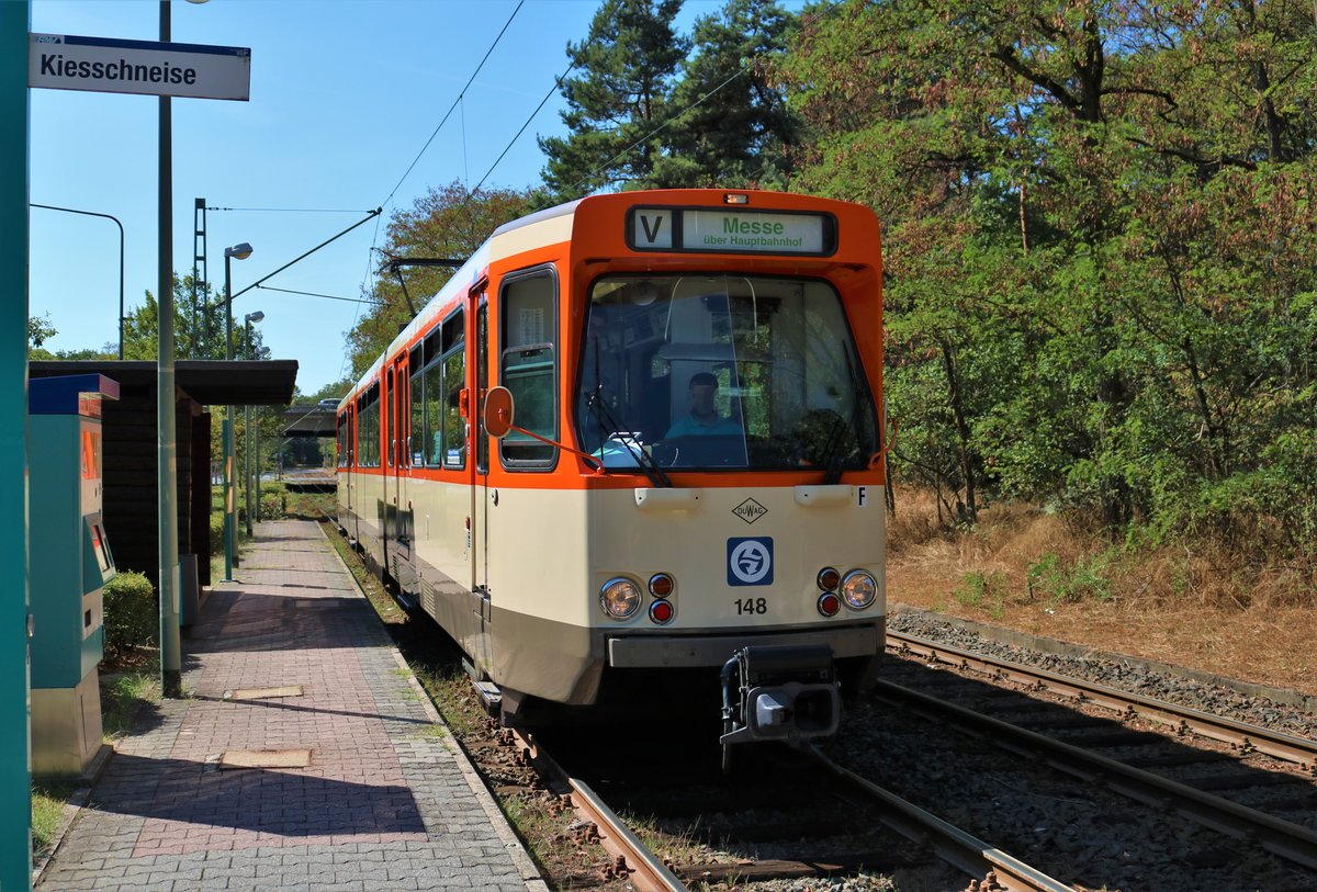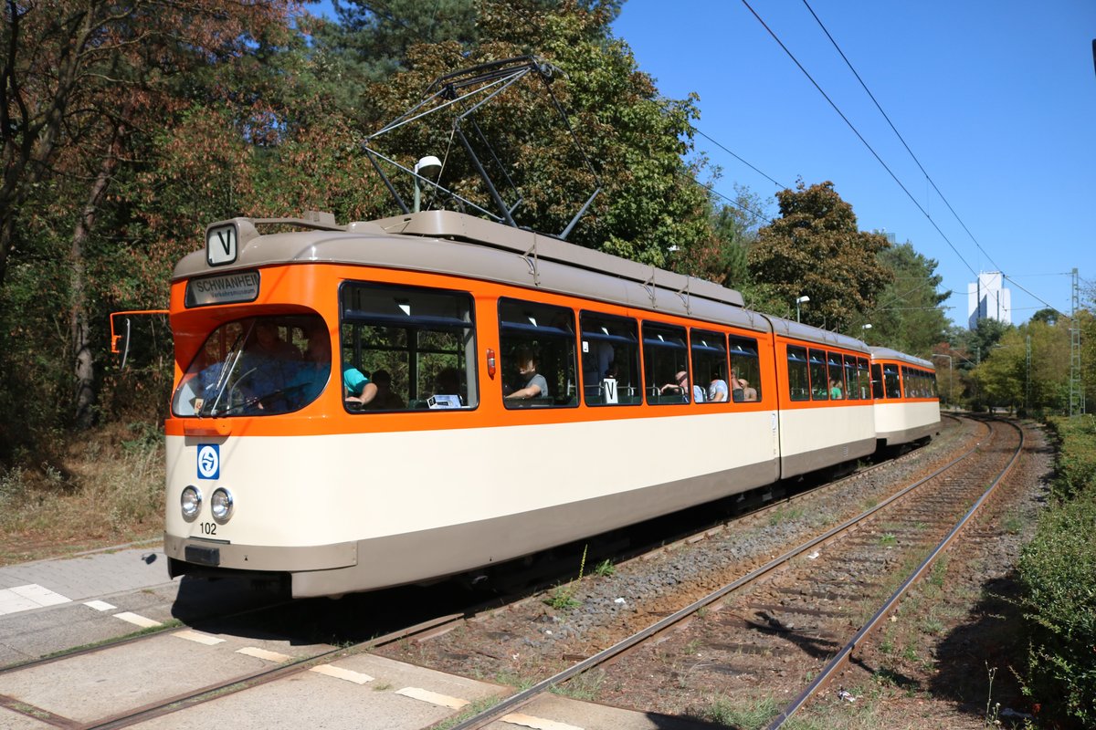 VGF Düwag M-Wagen 102 mit Beiwagen 1804 am 19.08.18 in Frankfurt am Main Schwanheimer Wald