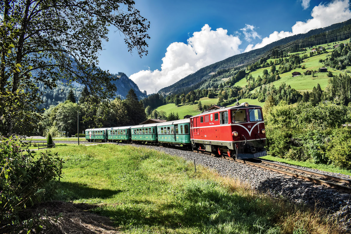 Vs 72 fährt mit dem Sdz 3391 (Krimml - Zell am See), kurz nach dem Bahnhof Krimml vorüber.