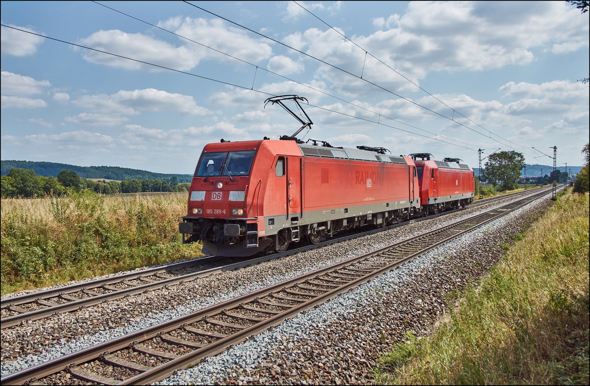 185 289-6 u.145 053-5 sind beide in Richtung Nürnberg unterwegs,gesehen am 16.08.2018 bei Pölling.