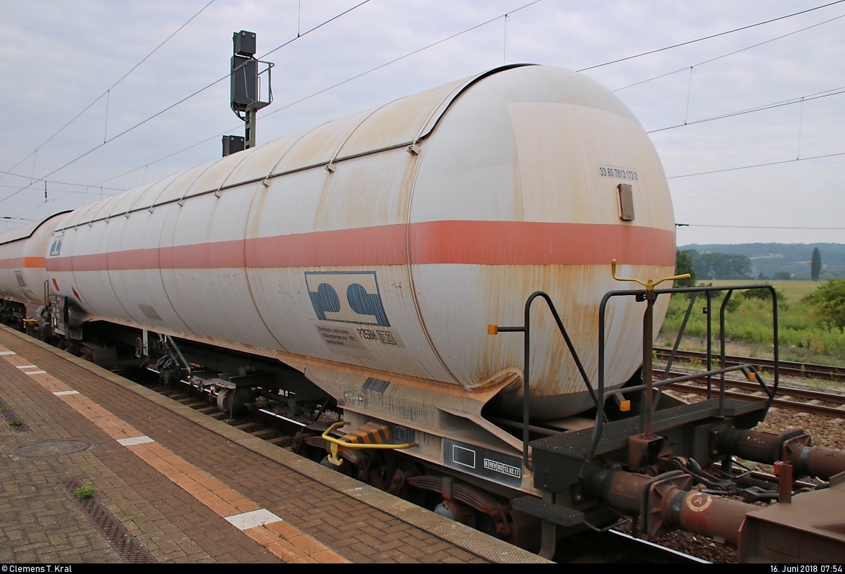 Blick auf einen Kesselwagen der Gattung "Zagkks" (NVR-Nummer nicht bekannt), der in einem gemischten Gz mit 187 ??? DB eingereiht ist und in Naumburg(Saale)Hbf auf Gleis 3 steht. [16.6.2018 | 7:54 Uhr]