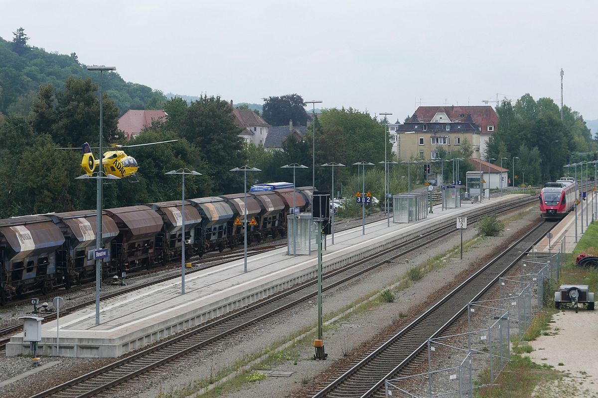 Überraschungen am 03.09.2018 im Bahnhof Biberach (Riß). Anstatt von Triebwagen der Baureihen 628 oder 650 auf Gleis 2 bzw. 3 steht auf Gleis 1 ein Triebwagen der Baureihe 644 als RB 22648 nach Ulm zur Abfahrt bereit. Zeitgleich landet auf der gegenüberliegende Seite des Bahnhofs ein Rettungshubschrauber.