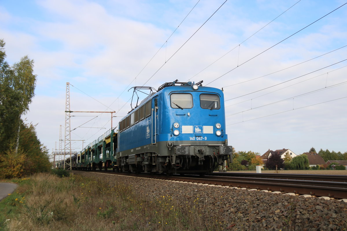 140 047 unterwegs mit ihrem leeren Autozug in Richtung Hannover am 27.9.18 durch Dedensen-Gümmer
