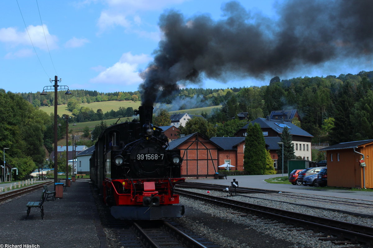99 1568-7 steht in Steinbach und fährt gleich nach Jöhstadt.