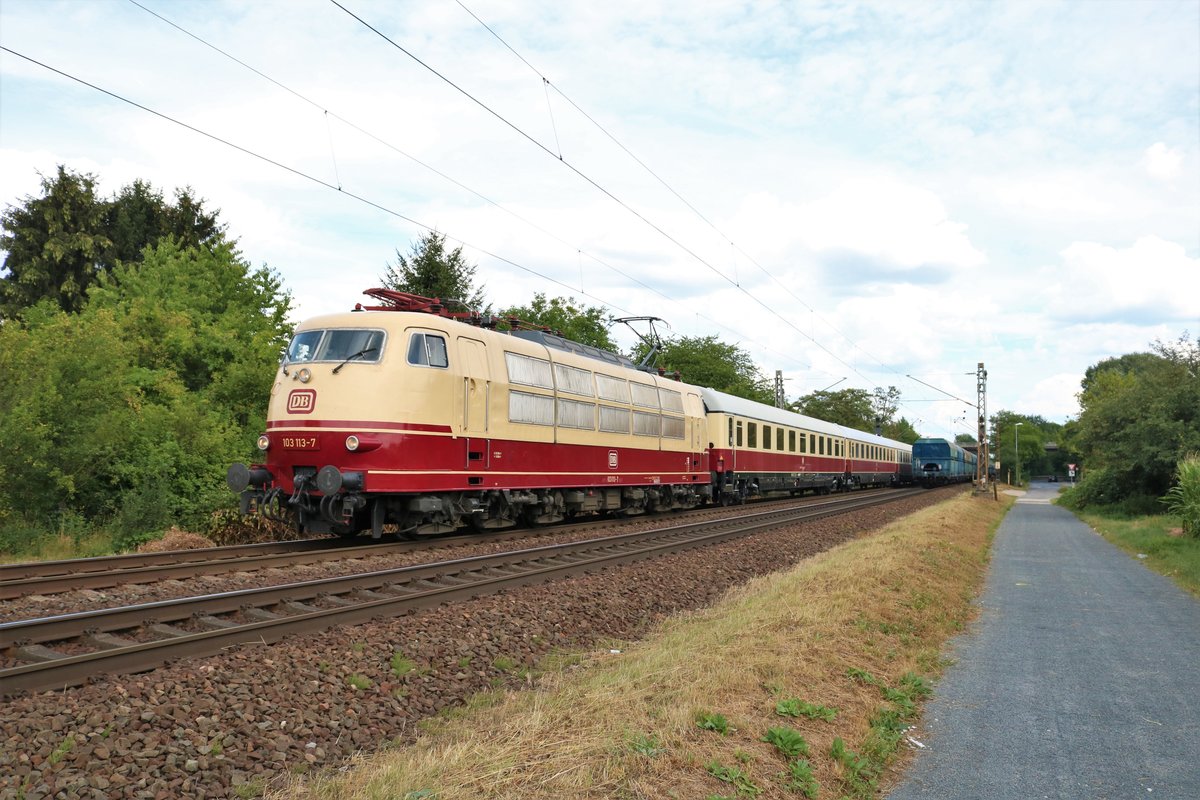 DB Museum 103 113-7 mit TEE Sonderzug am 29.07.18 bei Maintal Ost kurz davor kam noch ein Güterzug es war sehr knapp das Ende des Güterzugs sieht man noch