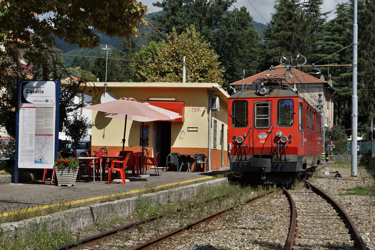 Triebwagen A 9 als Zug 12 kurz vor der Abfahrt auf dem Endhalt Casella Paese am 5. September 2018. Eine sehr gemütliche Stimmung herrscht in der kleinen BAR DEL TRENINO zur Bahn passend.