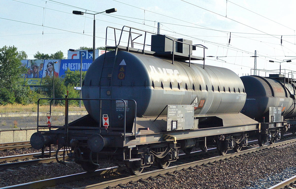 Interessanter Kesselwagen vom Einsteller VTG in Hamburg mit der Nr. 33 RIV 80 D-VTGD 7975 380-6 Zaces Bf.: Maschen Rbf. Tafelaufschrift: Phosphor Gelb (UN-Nr.: 46/1381 = Phosphor, weiß oder gelb, trocken, unter Wasser oder in Lösung) am 06.09.18 Bf. Flughafen Berlin-Schönefeld.
