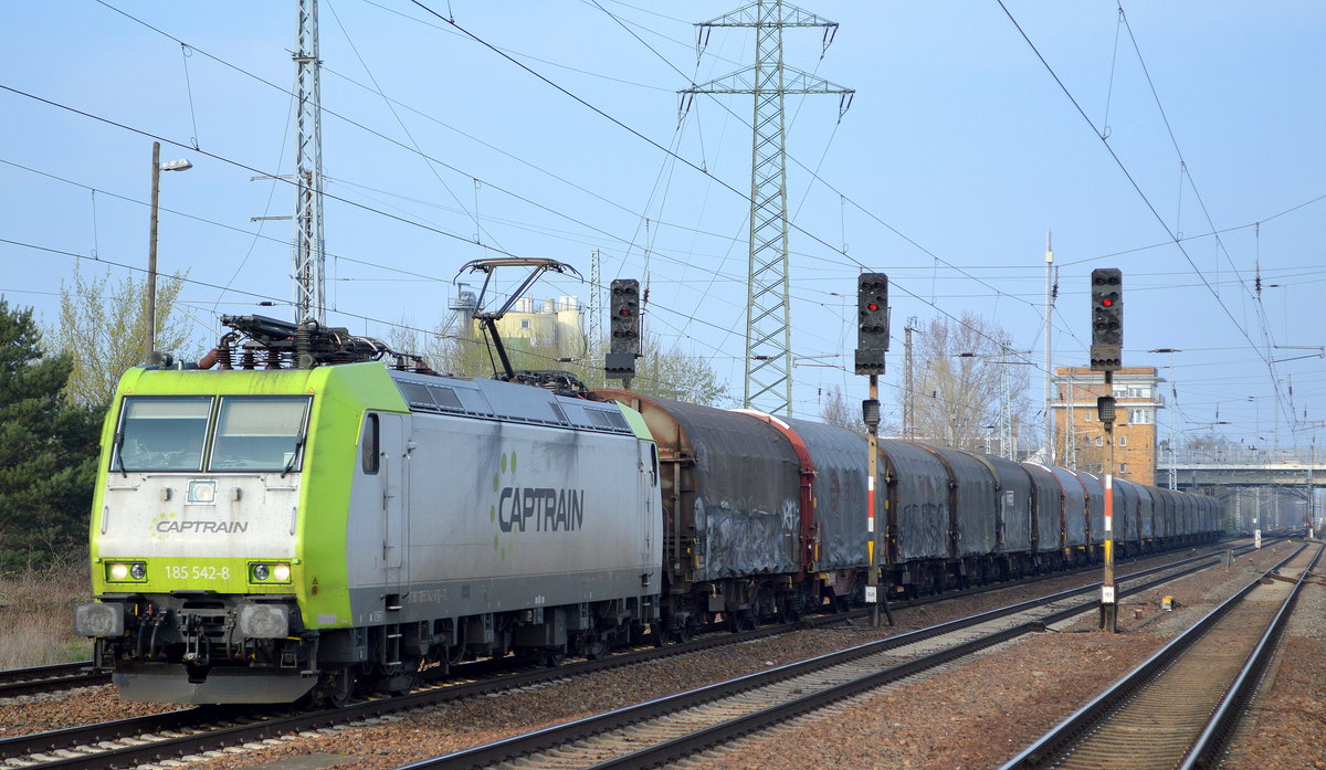 ITL - Eisenbahngesellschaft mbH mit "185 542-8" [NVR-Number: 91 80 6185 542-8 D-ITL] und einem Ganzzug Drehgestell-Flachwagen mit Schiebeplane für Coiltransporte am 05.04.19 Bf. Flughafen Berlin-Schönefeld.