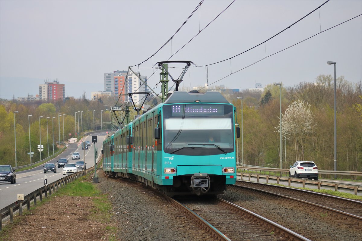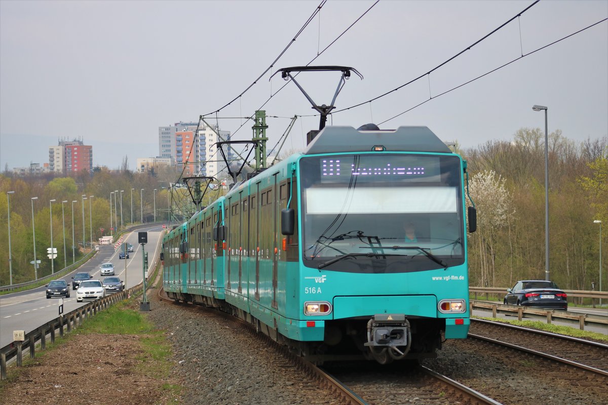 VGF Düwag U4 Wagen 516+5xx+5xxx als U1 am 06.04.19 in Frankfurt Niddapark vom Bahnsteig aus mit Tele Zoom fotografiert