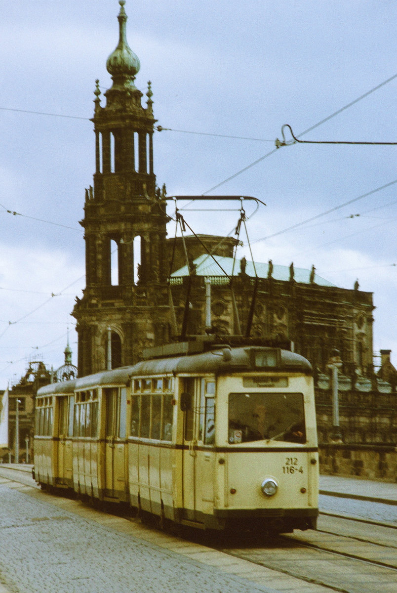 November 1984, Dresden, Straßenbahn in der Grunaer Straße. ET54 212 108 mit zwei EB 57 (263 009 und ?). Am rechten Rand verdrückt sich die "Ablösung", ein Roter Tatra.
