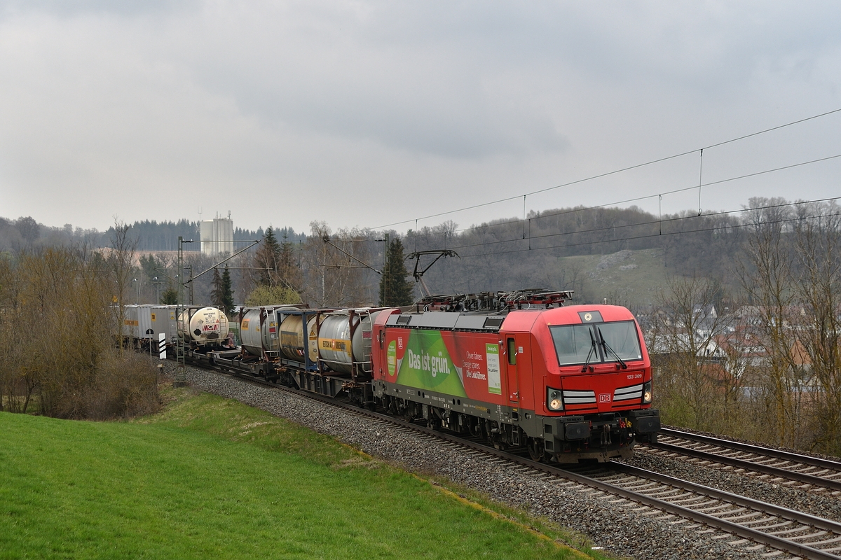 193 309 "Das ist grün" bespannte am 9. April 2019 einen Containerzug auf der Filstalbahn. Aufgenommen in Westerstetten.