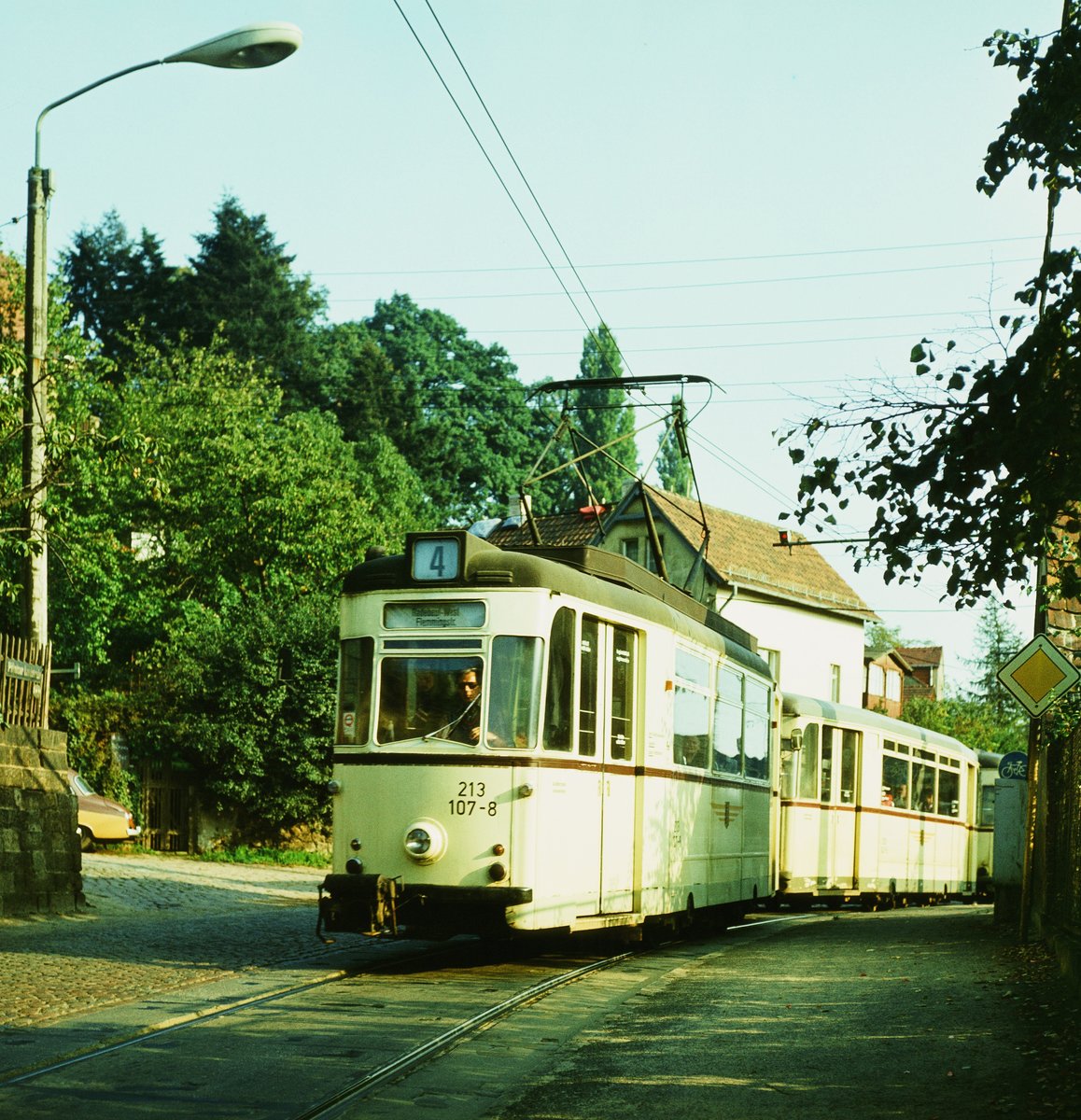21.10.1984, Dresden. Die Straßenbahn beginnt am Körnerplatz ihre Fahrt auf der engen, hügeligen und kurvigen Pillnitzer Landstraße nach Pillnitz. Das Foto des Gotha-Dreierzuges entstand an der DDR-Lustspielfilm-Fans aus dem Film "Geliebte Weiße Maus" bekannten Kreuzung. Der Schauspieler Rolf Herricht "regelte" in dem Film hier den Verkehr. Die Strecke wurde am 9. April 1985 stillgelegt, die Gotha-Wagen verschwanden mit Einführung der roten Tatra's.