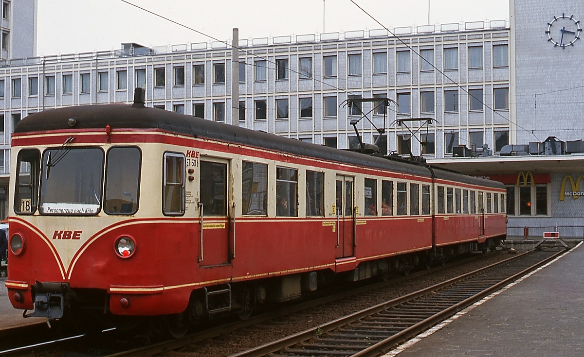 Mit einem Eilzug nach Köln trifft der ET 56 der Köln-Bonner Eisenbahn im Frühjahr 1978 in Rodenkirchen ein. Damals betrieb die KBE noch Güterverkehr, die umfangreichen Gleisanlagen sind verschwunden und dort, wo einmal der Güterschuppen stand, befindet sich heute ein P+R-Platz.