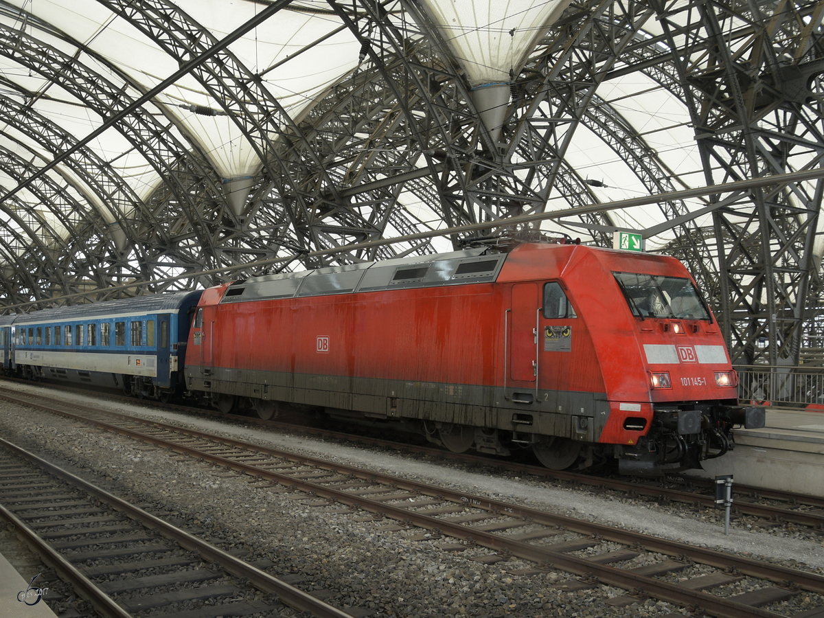 Die Elektrolokomotive 101 145-1 wartet am Dresdener Hauptbahnhof auf die Abfahrt. (April 2017)