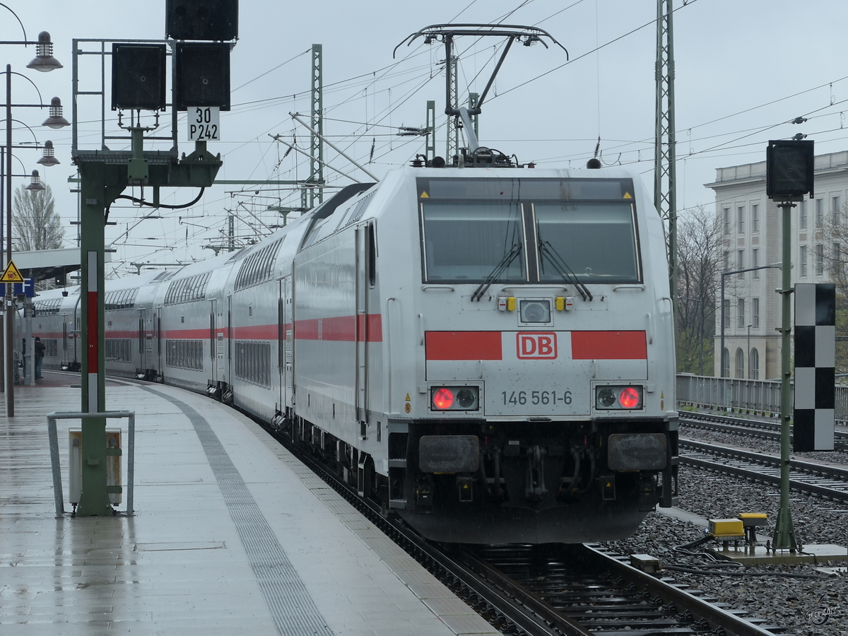 Die Elektrolokomotive 146 561-6 Anfang April 2017 mit einen IC bei der Abfahrt vom Dresdener Hauptbahnhof.
