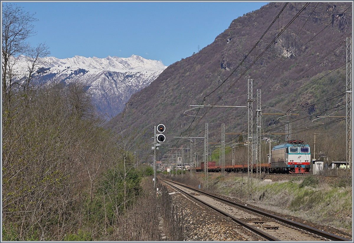 Die FS Trenitalia E 652.075 hat ihrem Güterzug in Premosselo-Chiovenda von der "Novara"-Strecke kommend auf die "Milano"-Strecke gewechselt und fährt nun kurz nach Premosello Chiovenda Richtung Arona.