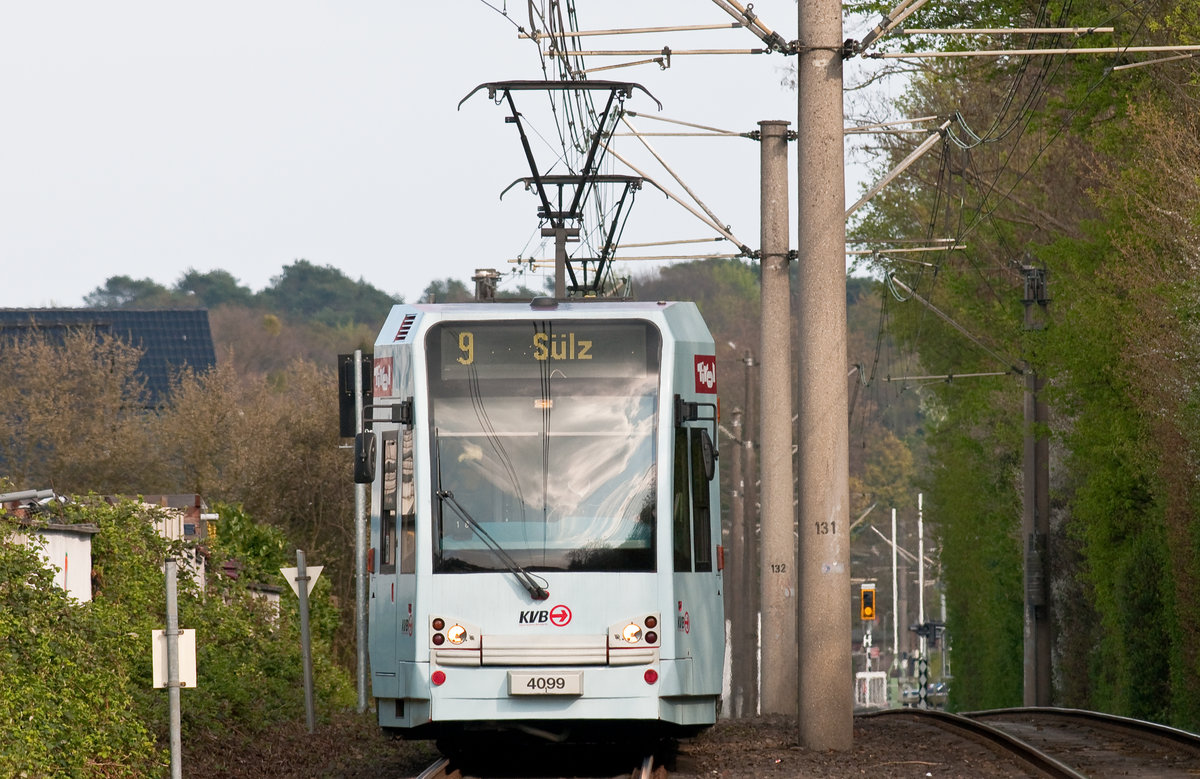Die Linie 9 mit der Wagennummer 4099 auf dem Weg nach Sülz. Aufgenommen an der KVB-Haltestelle Rath/Heumar am 13.4.2019.