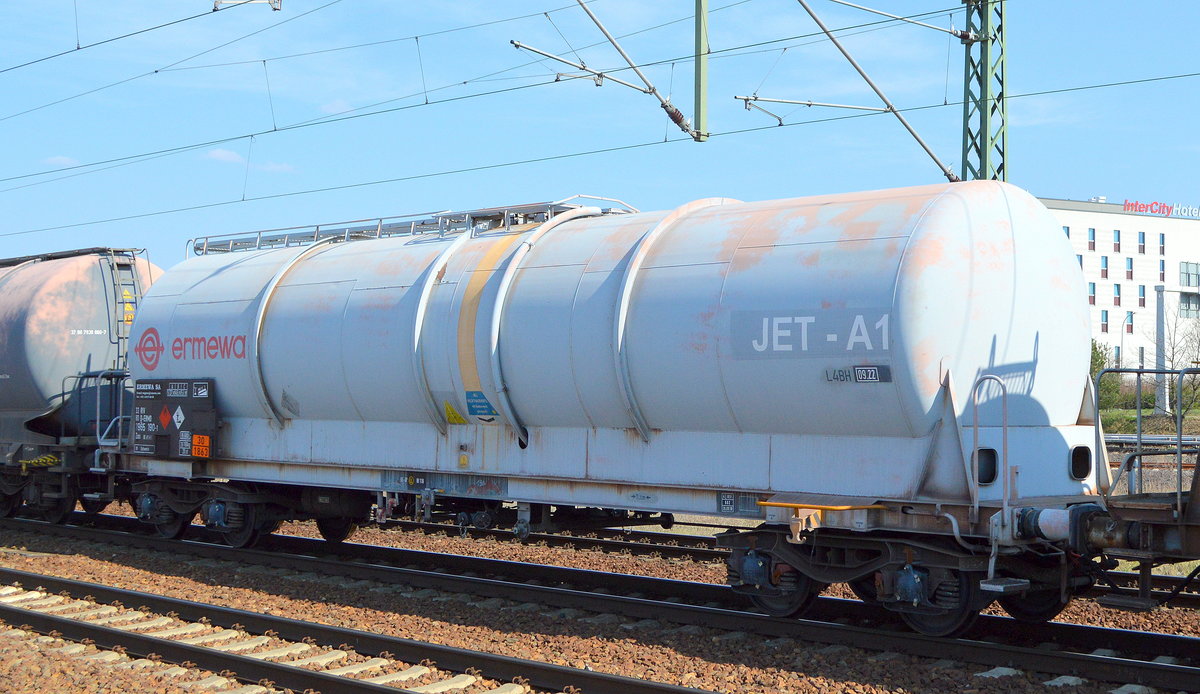 Kesselwagen vom Einsteller ERMEWA SA in Deutschland mit der Nr. 33 RIV 80 D-ERMD 7965 190-1 Zas Bf. Schwerin Aufschrift JET - A1 (UN-Nr. 30/1863 = Düsenkraftstoff, Dampfdruck bei 50 °C größer als 110 kPa) in einem Ganzzug am 04.04.19 Bf. Flughafen Berlin-Schönefeld.