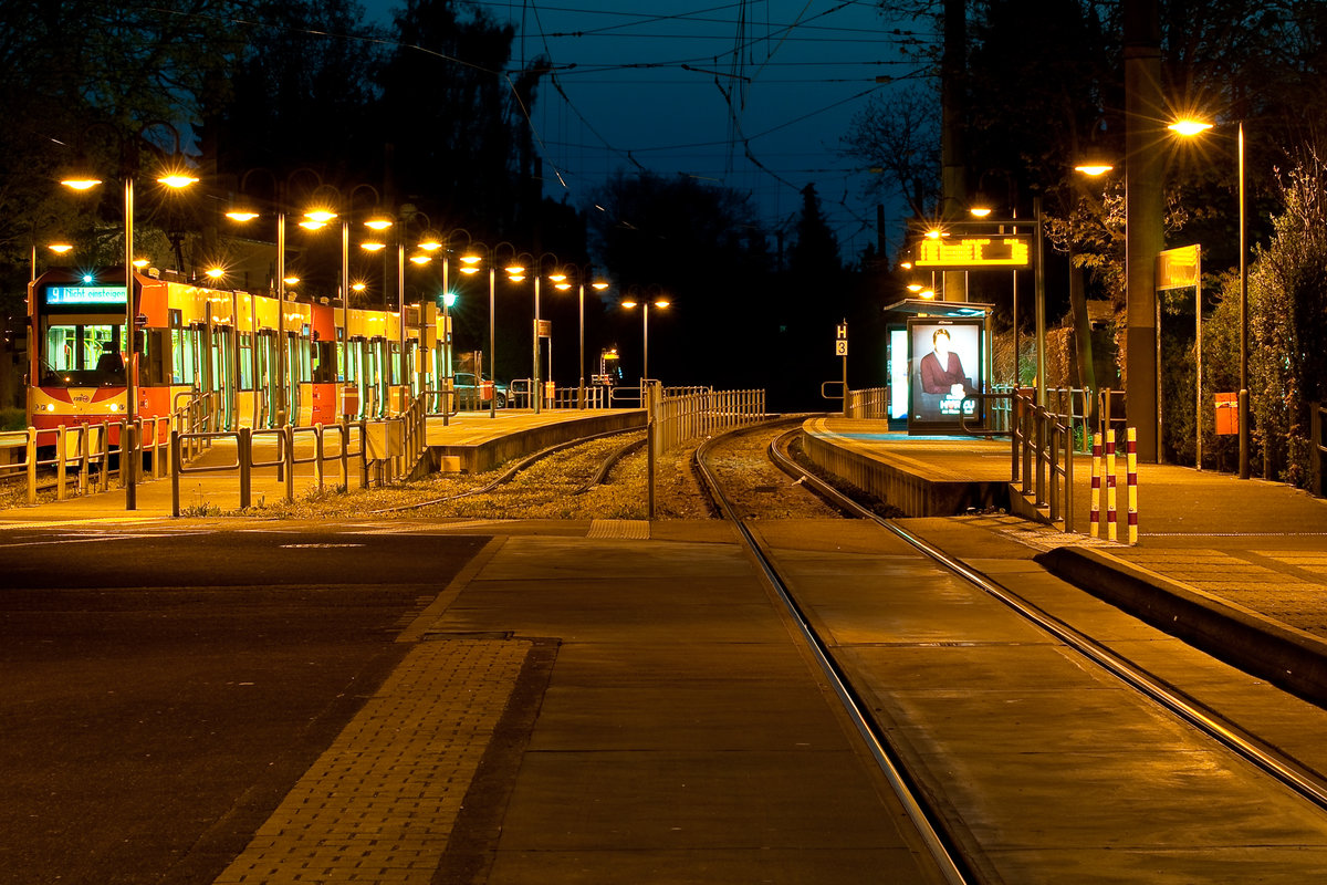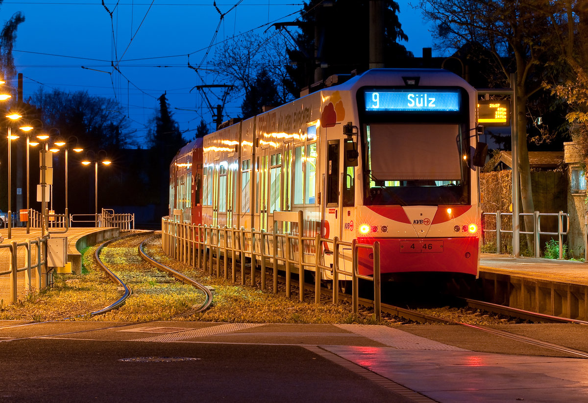 Die Linie 9 mit der Wagennummer 446 bei Nacht an der KVB-Haltestelle Königsforst.Aufgenommen am 14.4.2019