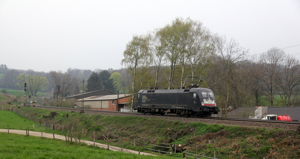 182 528-0 von MRCE/Crossrail kommt von einer Schubhilfe vom Gemmenicher Tunnel zurück nach Aachen-West. Aufgenommen von einem Weg in Reinartzkehl. Am Nachmittag vom 9.4.2019.