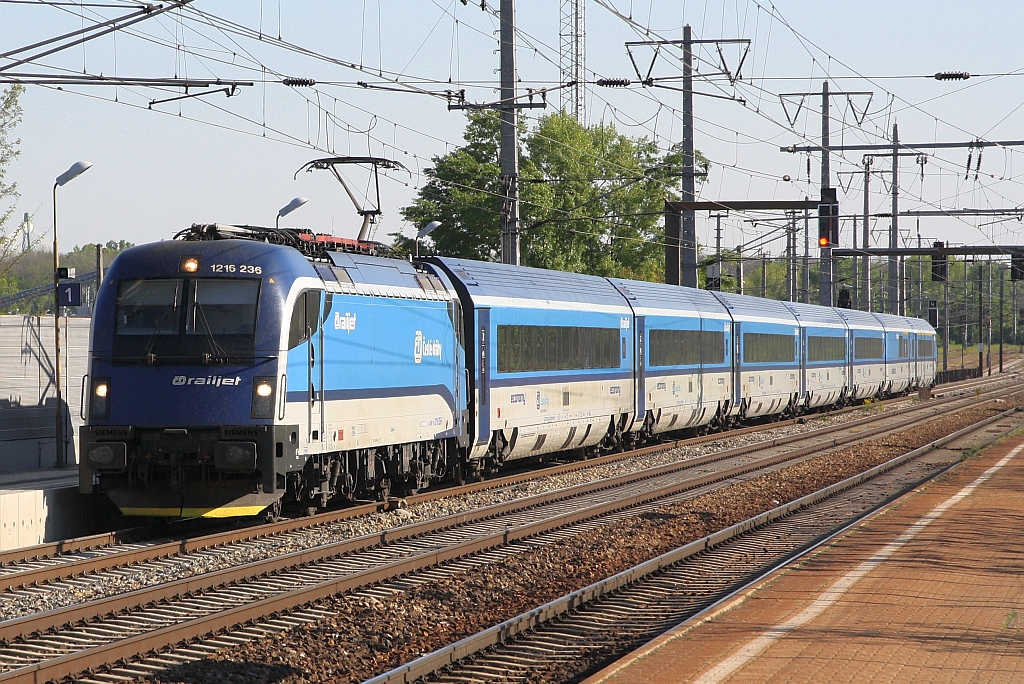 RJ 71 (Brno dolni nadrazi - Graz Hbf.) mit der 1216 236-0 an der Spitze fährt am 22.April 2019 durch die Haltestelle Haidestraße.