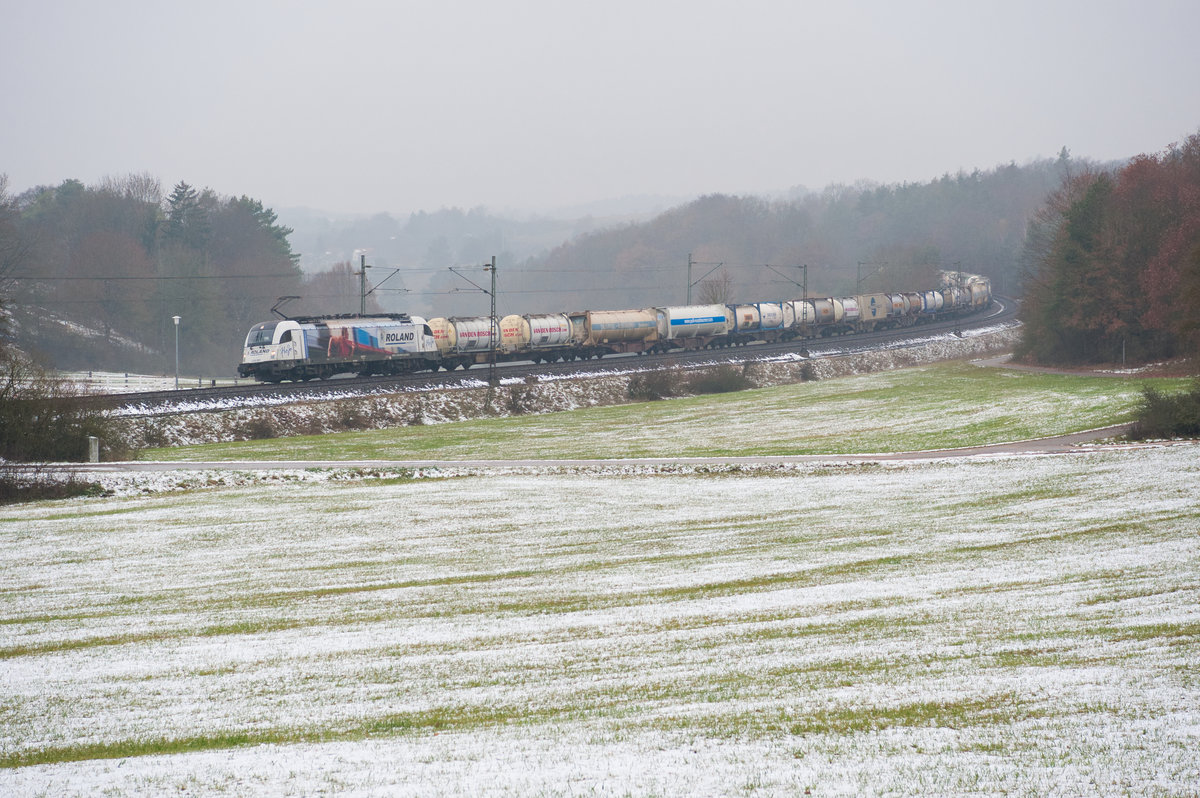 193 275 ELL/TXL "We love to connect" mit einem LKW-Walter KLV-Zug bei Edlhausen Richtung Regensburg, 22.11.2018