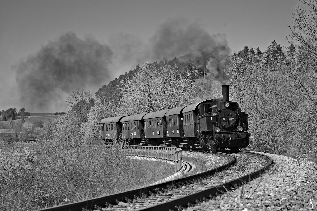 Zur Abwechslung ein Schwarzweißbild. Es zeit den Mittagszug kurz nach der Ausfahrt aus Zwettl und dem Überqueren des mächtigen Viadukts. Die drei Windräder im Hintergrund links wurden wegretuschiert. (20.04.2019)