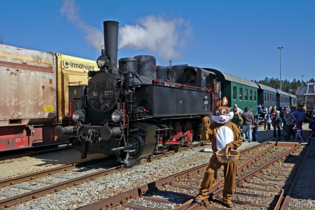 Am Ostersamstag veranstaltete der Martinsberger Lokalbahnverein drei Pendelfahrten zwischen Zwettl und Waldhausen. In Waldhausen angekommen lief mir der Osterhase über den Weg. Im Hintergrund die 92.2271. (20.04.2019)