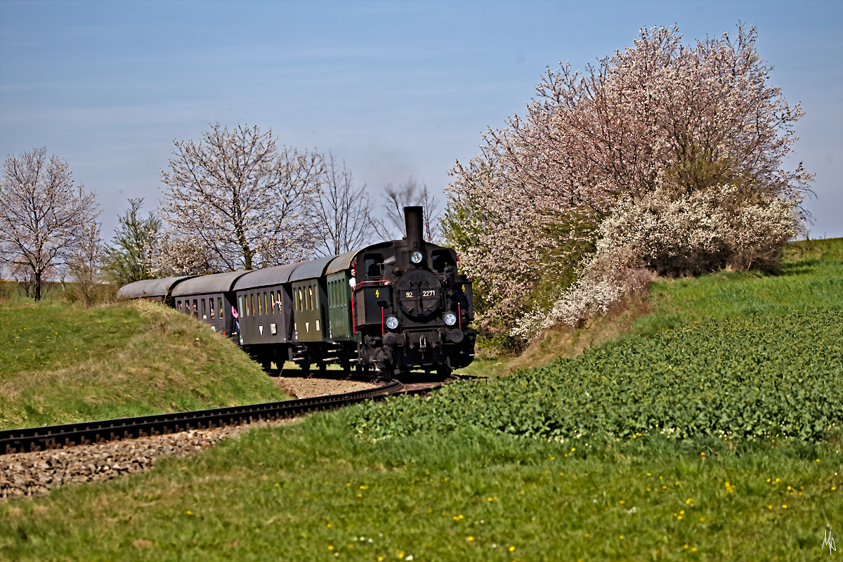Am Ostersamstag veranstaltete der Martinsberger Lokalbahnverein drei Pendelfahrten zwischen Zwettl und Waldhausen. Zu sehen ist hier die 92.2271 zwischen Obernondorf und Klein Schönau. (20.04.2019)