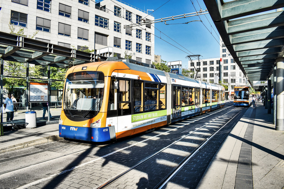 Der rnv-Tramwagen 4150, hält als Linie 5A (Heddesheim, Bahnhof (RNV) - Käfertal, Bahnhof - Mannheim, Hauptbahnhof), in der Endhaltestelle Mannheim, Hauptbahnhof.