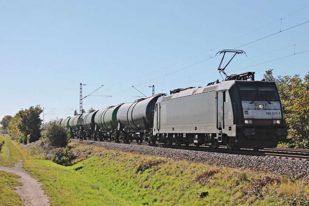 Mit einem leeren Kesselzug aus Glattburg (CH) fuhr am Mittag des 13.10.2017 die MRCE/SBBCI 185 571-7 bei Hügelheim durchs Markgräflerland in Richtung Norden.