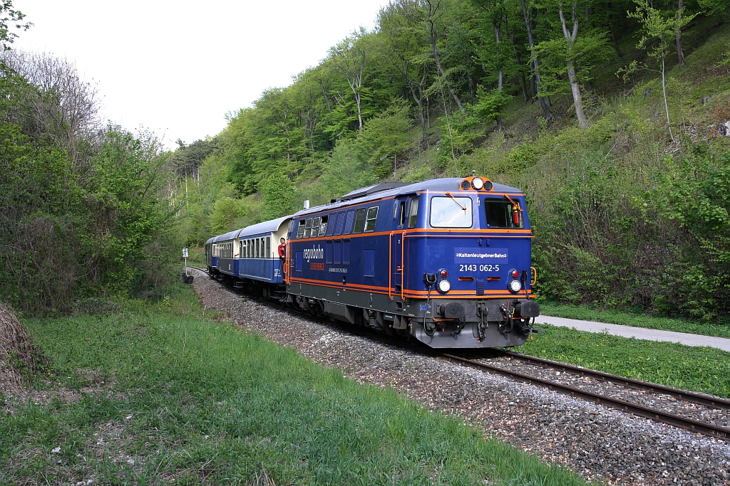 RBAHN 2143 062-5 am 22.April 2019 mit dem SEZ 14705 (Wien Meidling - Waldmühle) kurz vor der Lst. Waldmühle beim Strecken-Km. 5,0 der Kaltenleutgebenerbahn.