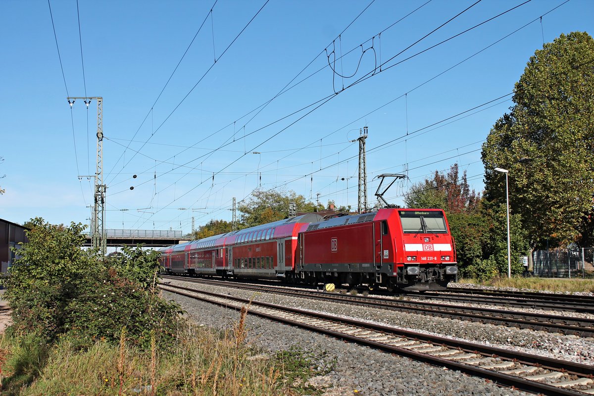 Nachschuss auf 146 231-6 am 13.10.2017, als sie mit ihrer RB (Basel Bad Bf - Offenburg) aus dem Bahnhof von Müllheim (Baden) gen Buggingen fuhr.