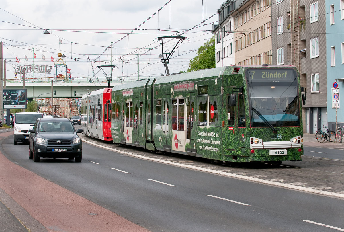 Die Linie 7 mit der Wagennummer 4122 auf dem Weg nach Zündorf. Aufgenommen am 26.4.2019.