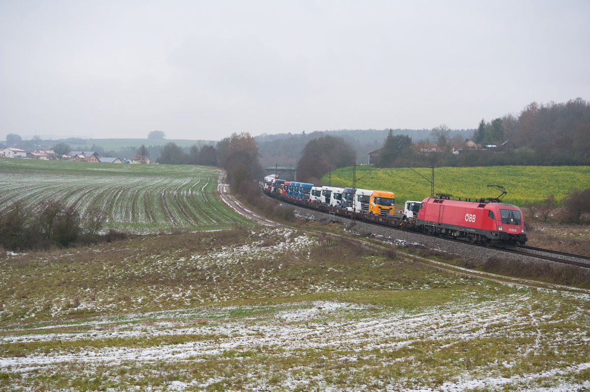 1116 183 mit neuen Nutzfahrzeugen bei Edlhausen Richtung Regensburg, 22.11.2018