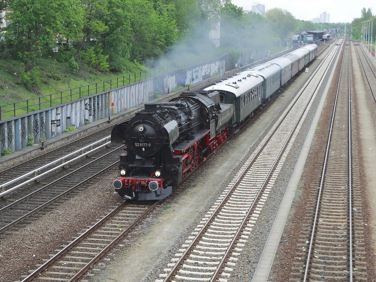 Am Nachmittag des 27. April 2019 dann die dritte Runde der 52 8177-9 auf dem S-Bahn Innenring kurz vor der Unterquerung der Hertabrücke in Berlin Neukölln.