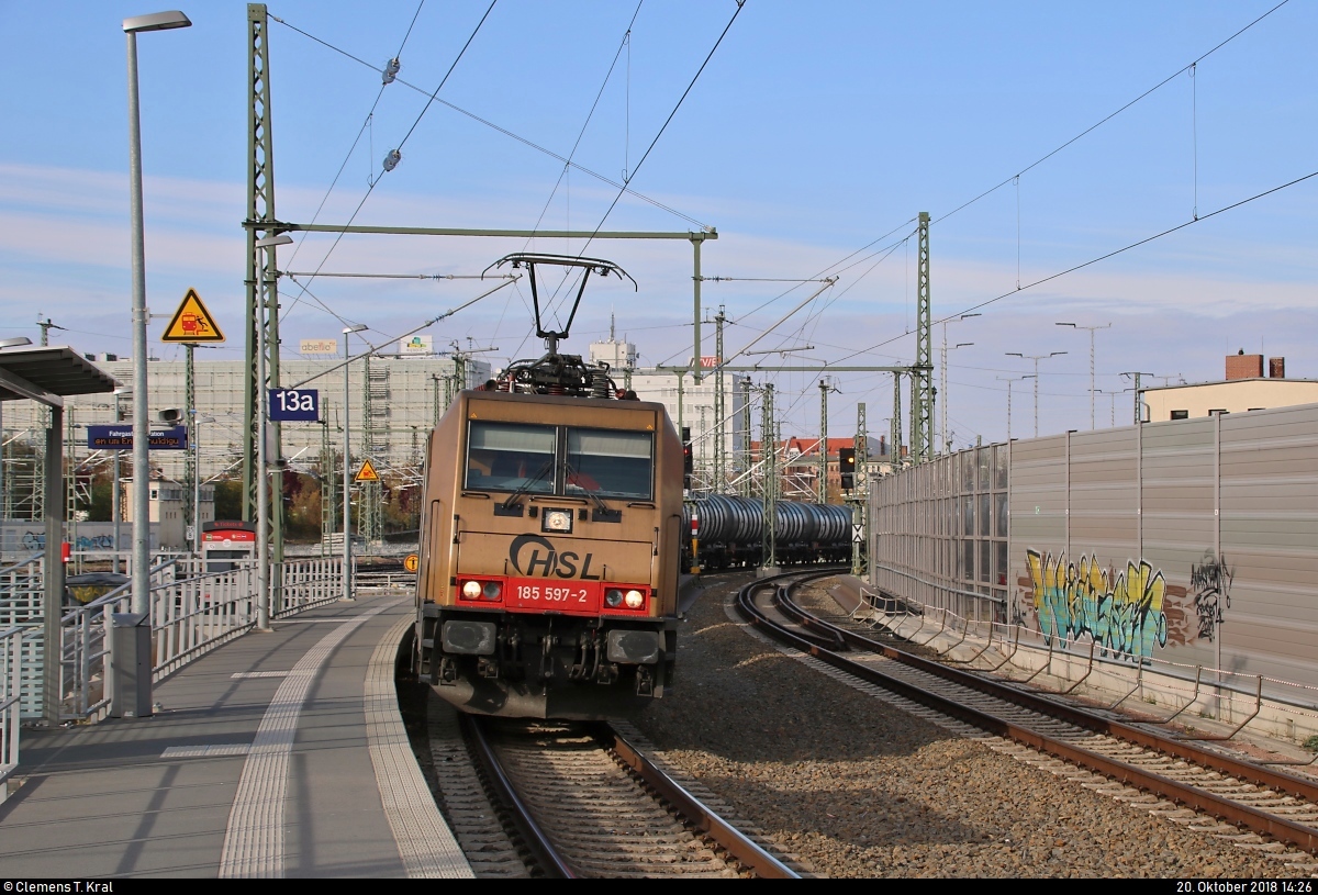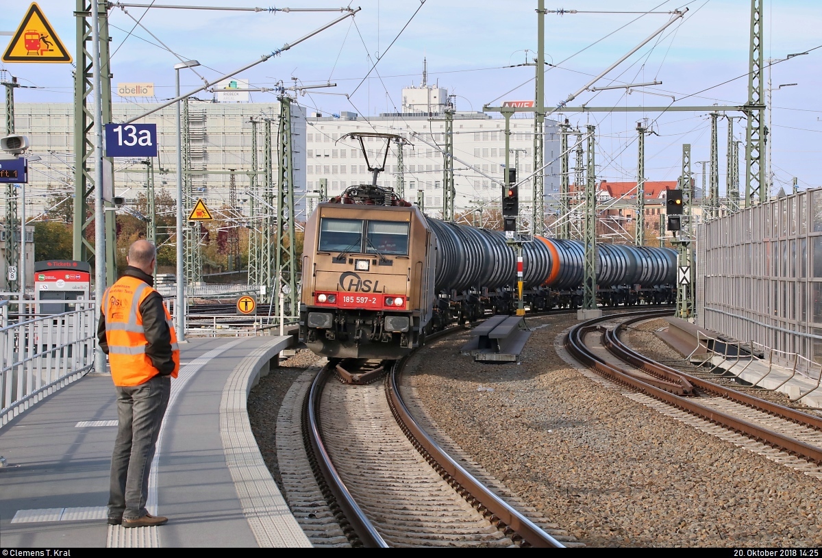 Aufgrund eines Personalwechsels steht ein Kesselzug mit der goldenen 185 597-2 der Beacon Rail Leasing Ltd., vermietet an die HSL Logistik GmbH, kurzzeitig am Interimsbahnsteig Halle(Saale)Hbf Gl. 13a auf der Ostumfahrung für den Güterverkehr.