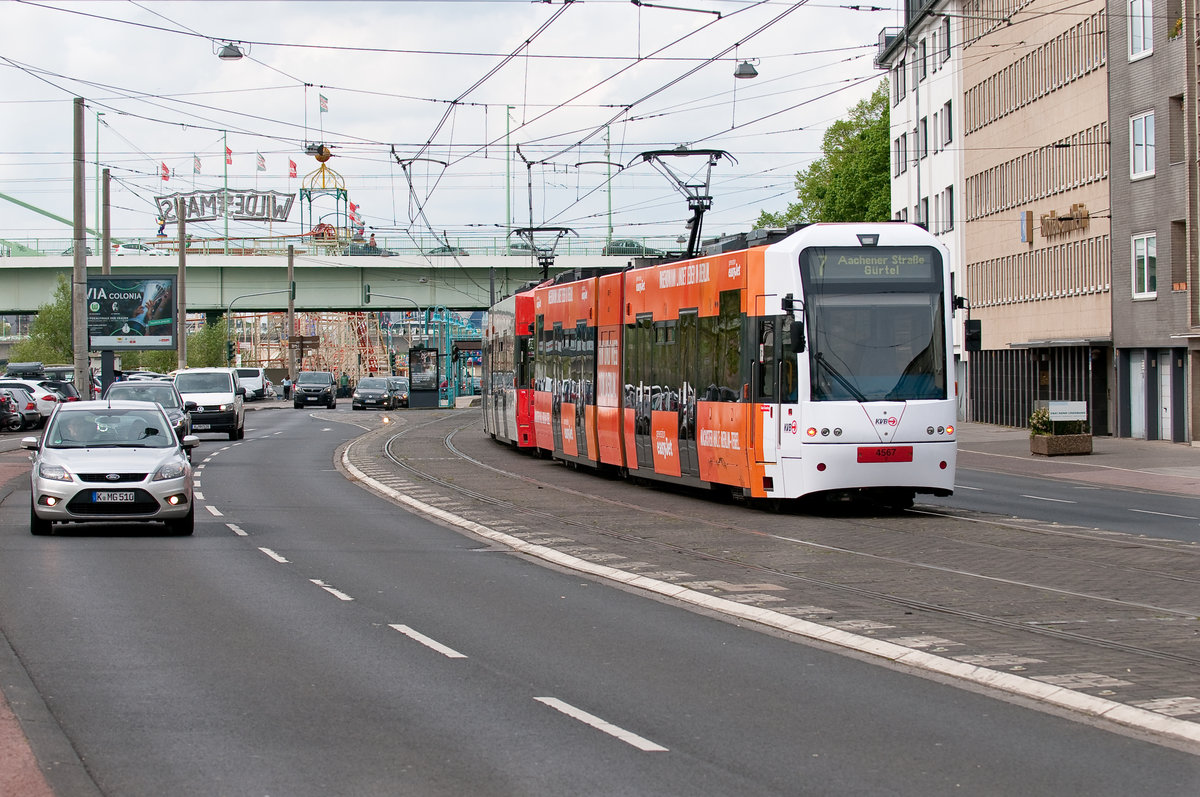 Die Linie 7 mit der Wagennummer 4567 auf dem Weg zur Achener Straße Gürtel. Aufgenommen am 26.4.2019.