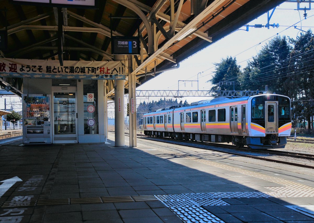 Die Nordwestküste Japans, am Japanischen Meer: Die Hauptlinie Niigata - Akita, Bahnhof Murakami. Hier am nördlichen Ende der Gleichstromstrecke ab Niigata steht Lokalzug Serie E129 (Nr. 113). Der Bahnhof verkündet: "Willkommen in Murakami, der Stadt des Lachses und der heiss sprudelnden Quellen" (Gut Essen und sich im heissen Wasser entspannen sind mit Abstand die Hauptattraktionen des japanischen Inland-Tourismus). 18.März 2019