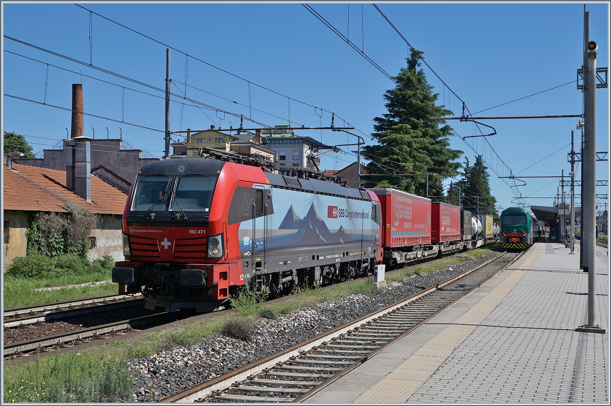 Die SBB Cargo International Re 475 471 "Karlsruhe" (UIC 91 80 6193 471-0 D-SIEAG) mit einem langen Güterzug in Gallarate.