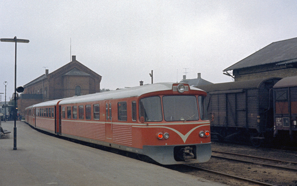 Gribskovbanen (GDS): Ein Triebzug (Ym + Ys + Ym + Ys) hält am 11. Oktober 1970 im Bahnhof Hillerød. - Die Züge der GDS bedienten die Bahnstrecken Hillerød - Kagerup - Tisvildeleje / Gilleleje. - Sowohl die Triebwagen (Ym) als die Steuerwagen (Ys) waren von der Waggonfabrik Uerdingen gebaut worden. Die Ym hatten zwei 180 PS Büssing-Dieselmotoren des Typs U11. - Allmählich bekamen viele dänische Privatbahnen Triebzüge dieses speziell für Dänemark hergestellten Typs. Auf der von den Midtjyske Jernbaner betriebenen Bahnstrecke Vemb - Lemvig - Thyborøn (Lemvigbanen) fahren noch Züge dieses Typs. - Scan eines Farbnegativs. Film: Kodak Kodacolor X.