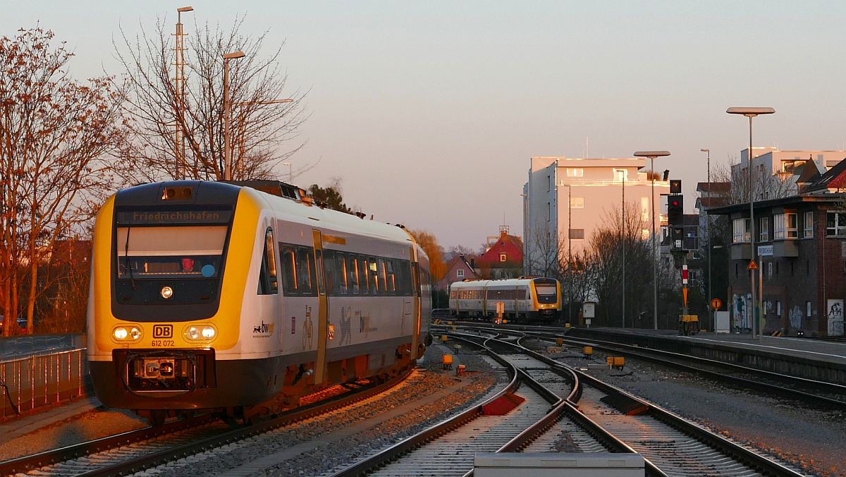 Nachdem 612 072 als RE 22593 von Aulendorf nach Friedrichshafen seine Fahrt beendet hatte, befindet er sich hier auf der zweiten Rangierfahrt zur Abstellung (20.03.2019).