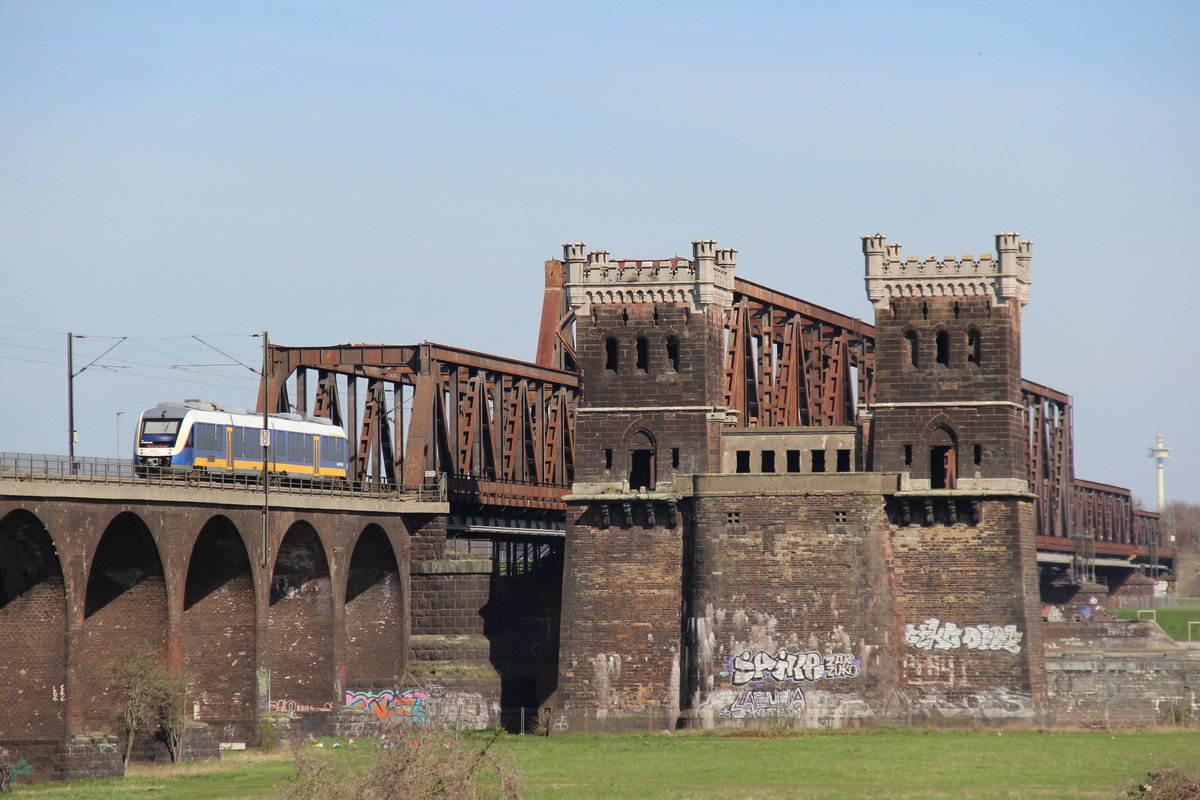 Ein LINT der NordWestBahn auf dem Weg von Duisburg nach Xanten beim Überqueren des Rheins zwischen Duisburg-Hochfeld und Rheinhausen im Frühling 2018