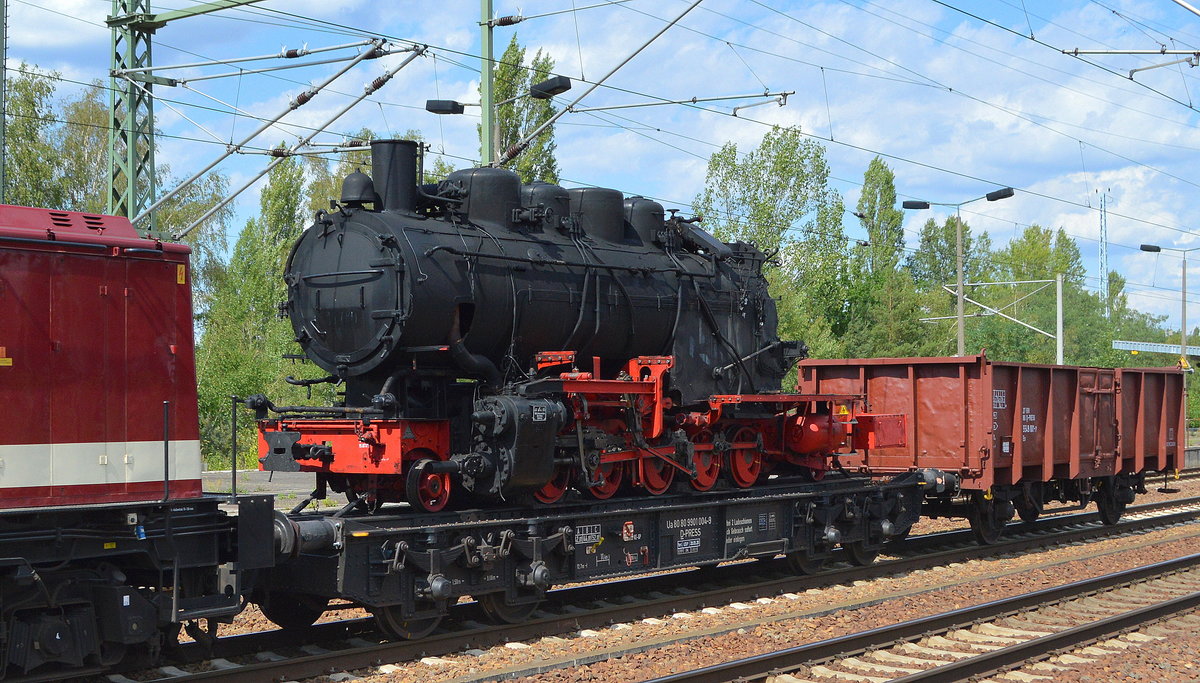 PRESS - Eisenbahn-Bau- und Betriebsgesellschaft Pressnitztalbahn mbH mit "114 703-2" [NVR-Nummer: 92 80 1203 230-8 D-PRESS] überführt eine Schmalspurdampflokomotive auf Spezialtransportwagen + Schutzwagen am 08.08.19 Bahnhof Flughafen Berlin-Schönefeld.